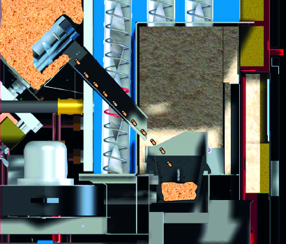 Il caricamento nel bruciatore avviene dall’alto con un sistema che garantisce un idoneo livello di prodotto nel bruciatore per facilitare l’accensione, rendere stechiometrica la combustione, avere una fiamma pulita con abbattimento delle polveri e dei residui carboniosi, con uscita fumi al di sotto dei 120°C anche ai massimi livelli di potenza esercitata.