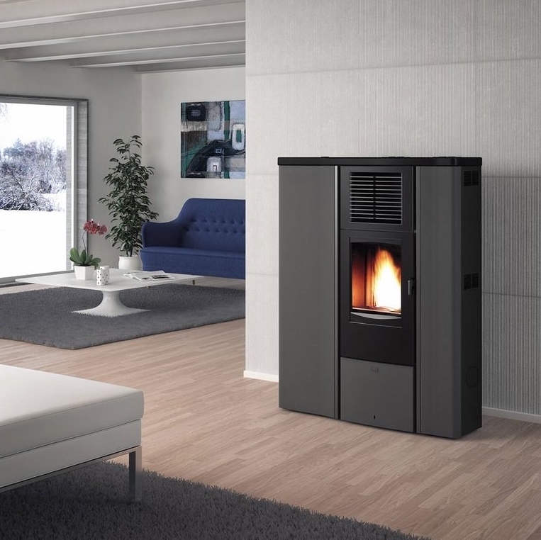 Stufa a pellet Lia canalizzabile a ventilazione forzata, con rivestimento in acciaio verniciato, pianale in maiolica.