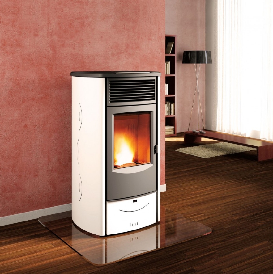 Stufa a pellet Sabrina a ventilazione forzata, rivestita in acciaio verniciato con pianale in ghisa e inserto in maiolica.