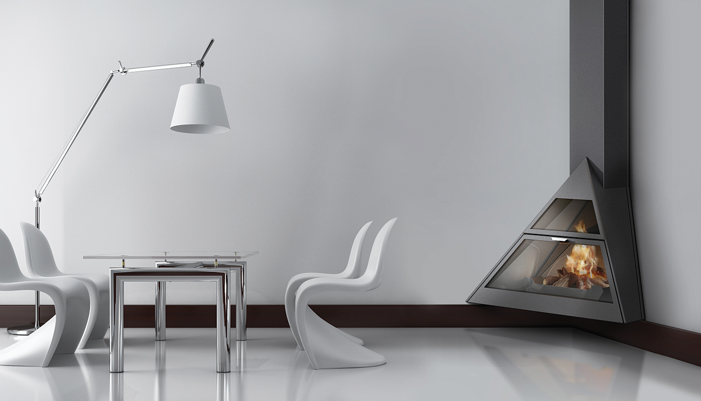 Camino con supporto, ad angolo, con porta protettiva e vetro su tre lati, comprensivo di scarico fumi telescopico posteriore. I camini Traforart trasmettono la passione per il design, dando la possibilità di personalizzare i modelli con diversi colori o finiture, e di creare modelli su misura, permettendo di poter dar vita alle tue idee, per l’arredo e il riscaldamento della vostra casa.